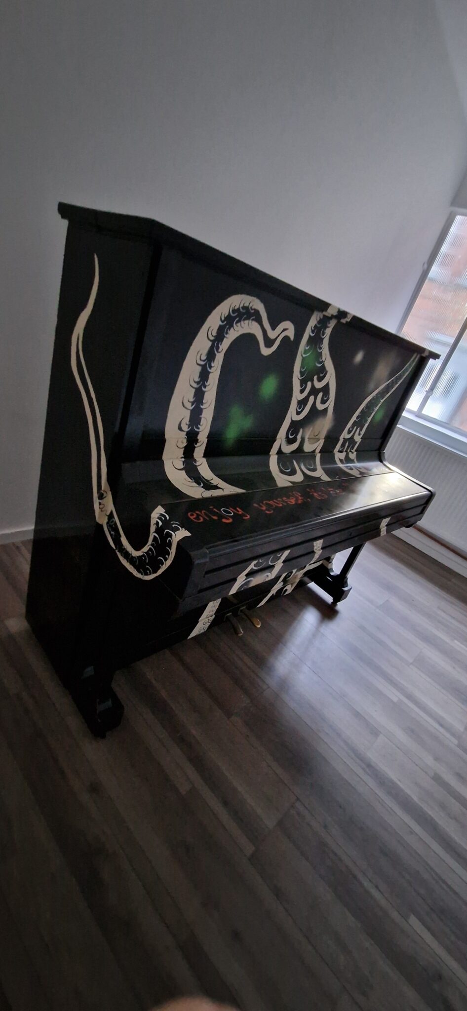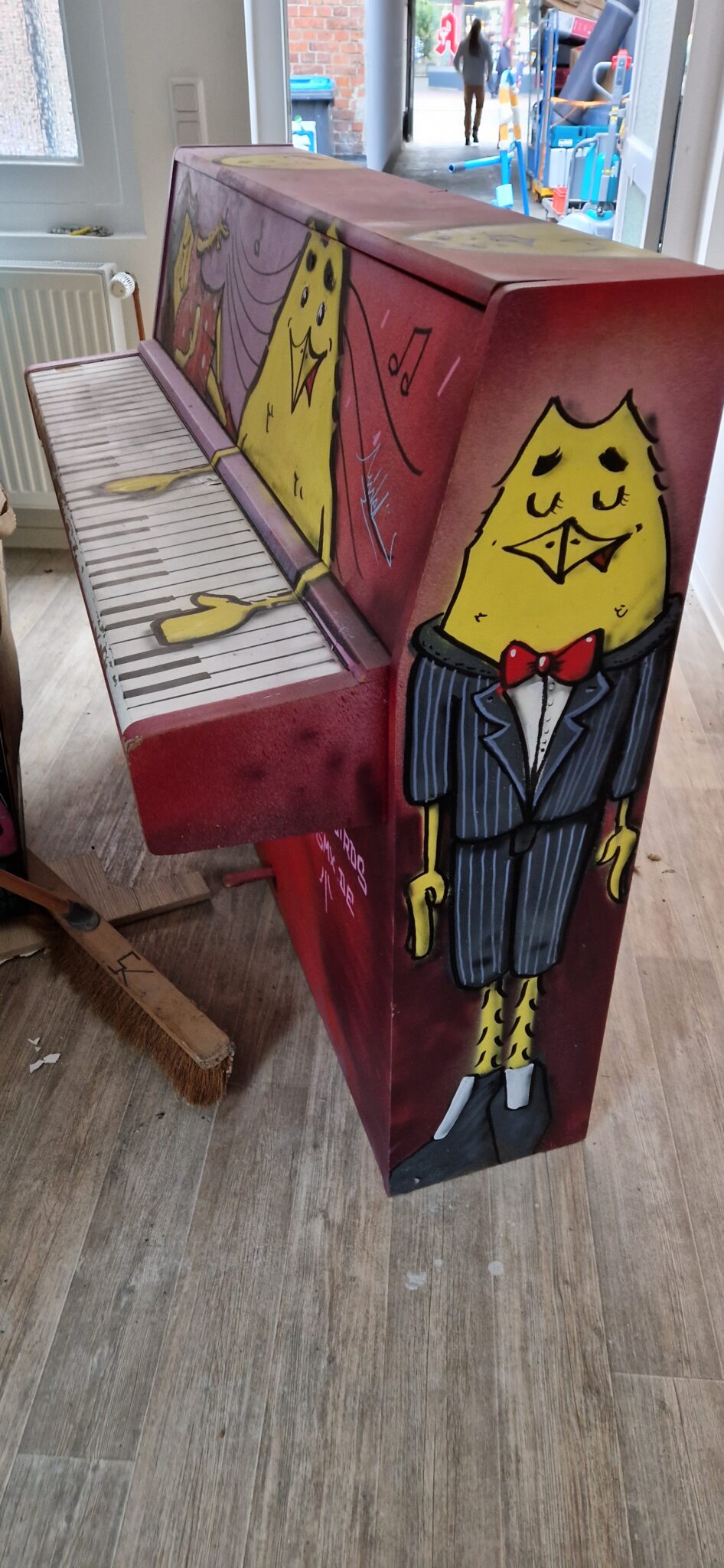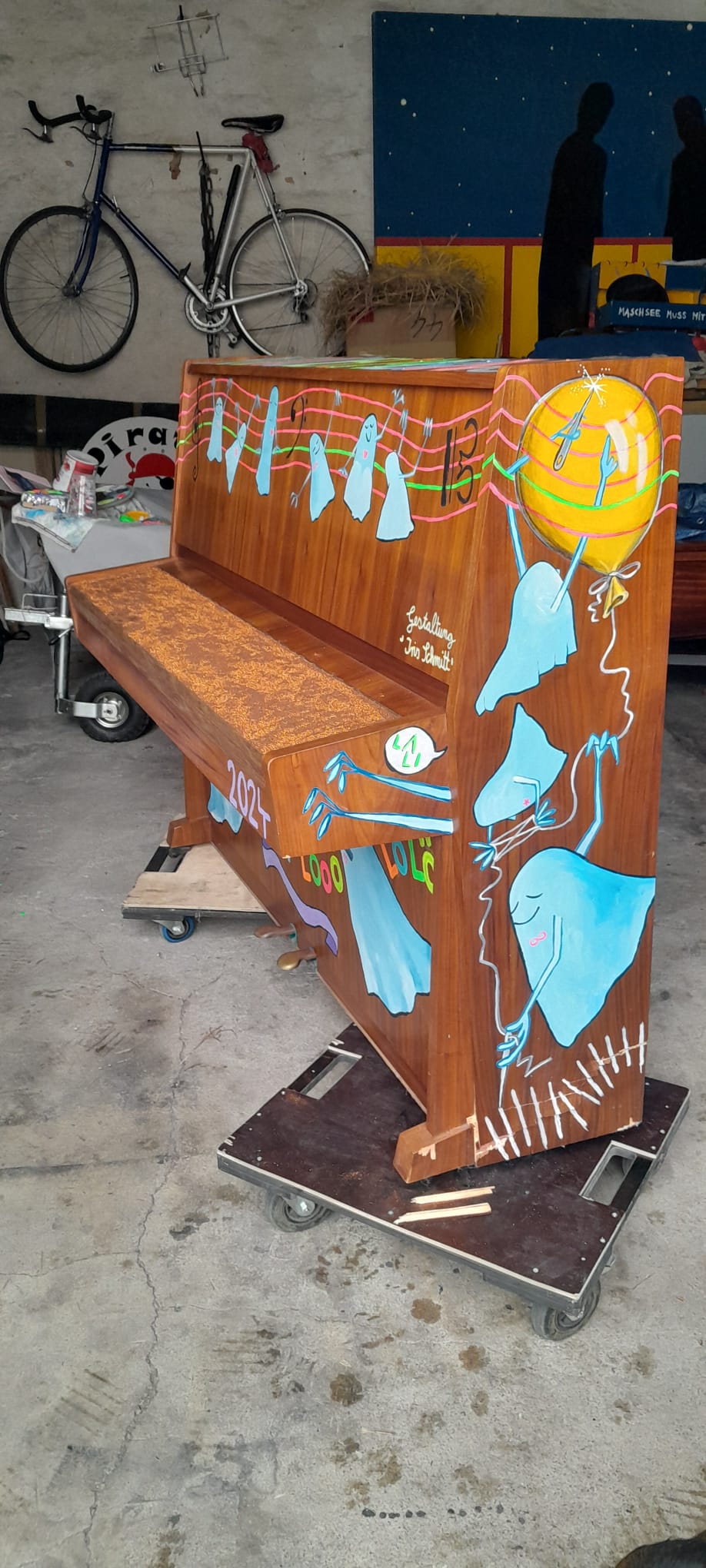 Seit 2023 besorgen wir ausgediente Klaviere (oft von Kleinanzeigen), lassen diese stimmen und von kreativen Graffitikünstler gestalten und anschließend stellen wir sie, mitunter unabgesprochen, an öffentlich zugänglichen Plätzen ab